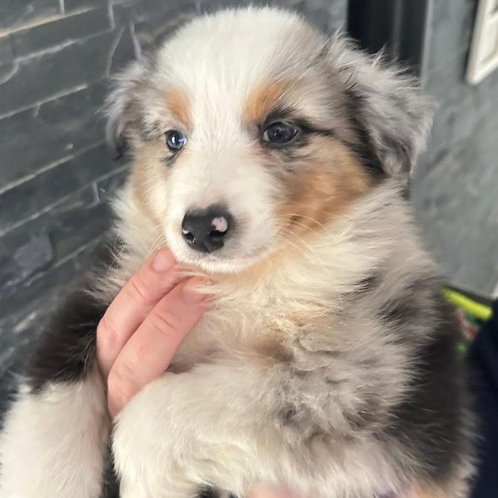 Magnifique male bleu merle aux deux yeux bleu ciel, qu'il s'empresse de donner à sa descendance. La petite femelle Umeko le montre bien (sa fille). D'un caractère calme, c'est un chien proche de l'humain qui adore les câlins et le jeu; Avec la meute il est...